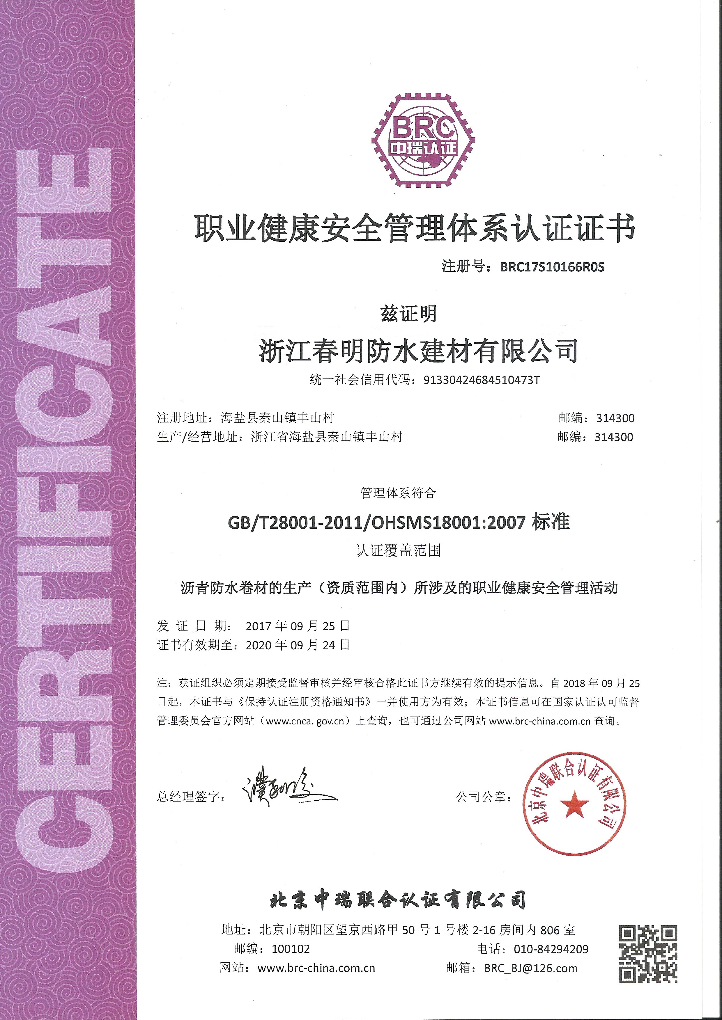 - 公司通過職業(yè)健康安全管理體系認證 2017-09-20 2017年9月15-19日,浙江春明防水建材有限公司職業(yè)健康安全管理體系經(jīng)過中瑞聯(lián)合認證公司現(xiàn)場監(jiān)督審查,順利通過了職業(yè)健康安全管理