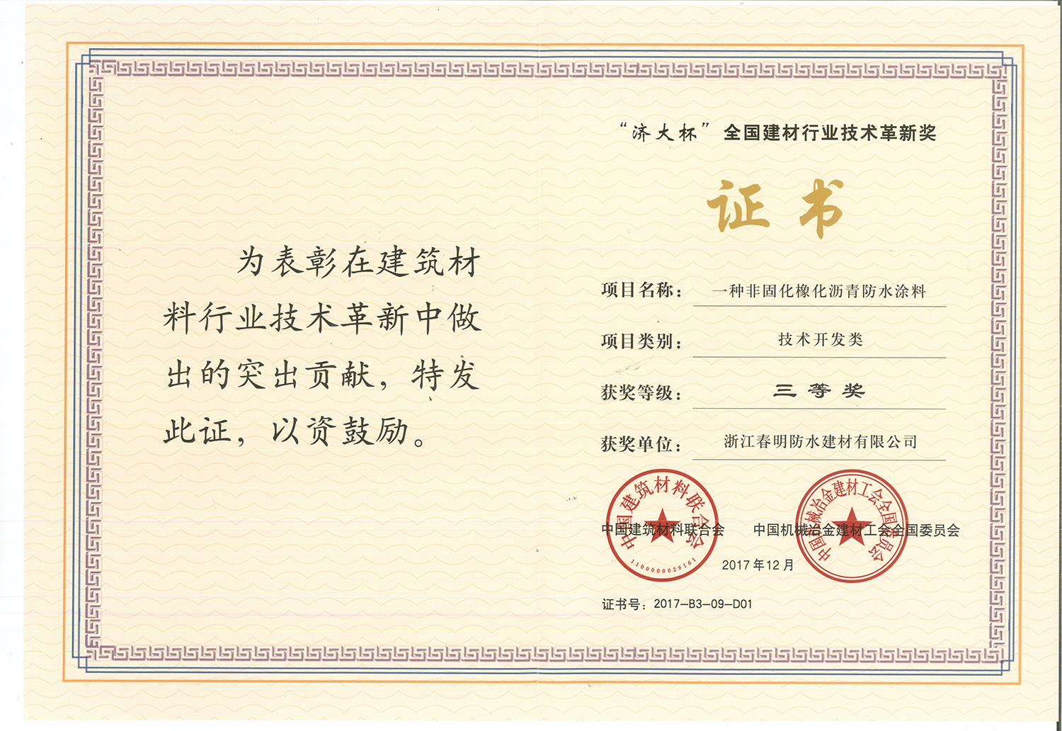 - 熱烈祝賀公司獲得“濟大杯”全國建材行業(yè)技術(shù)革新獎 2018-05-21 浙江春明防水有限公司在企業(yè)運行中,高度重視企業(yè)的技術(shù)創(chuàng)新工作,以技術(shù)創(chuàng)新引領企業(yè)發(fā)展,取得了顯著的成績。公司先后